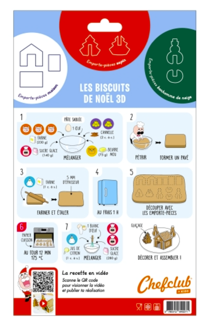 Une recette illustrée, à suivre pas à pas avec les emporte-pièces, disponible en vidéo (scannez simplement le QR code au dos de l'emballage pour accéder à tous les détails de la recette)